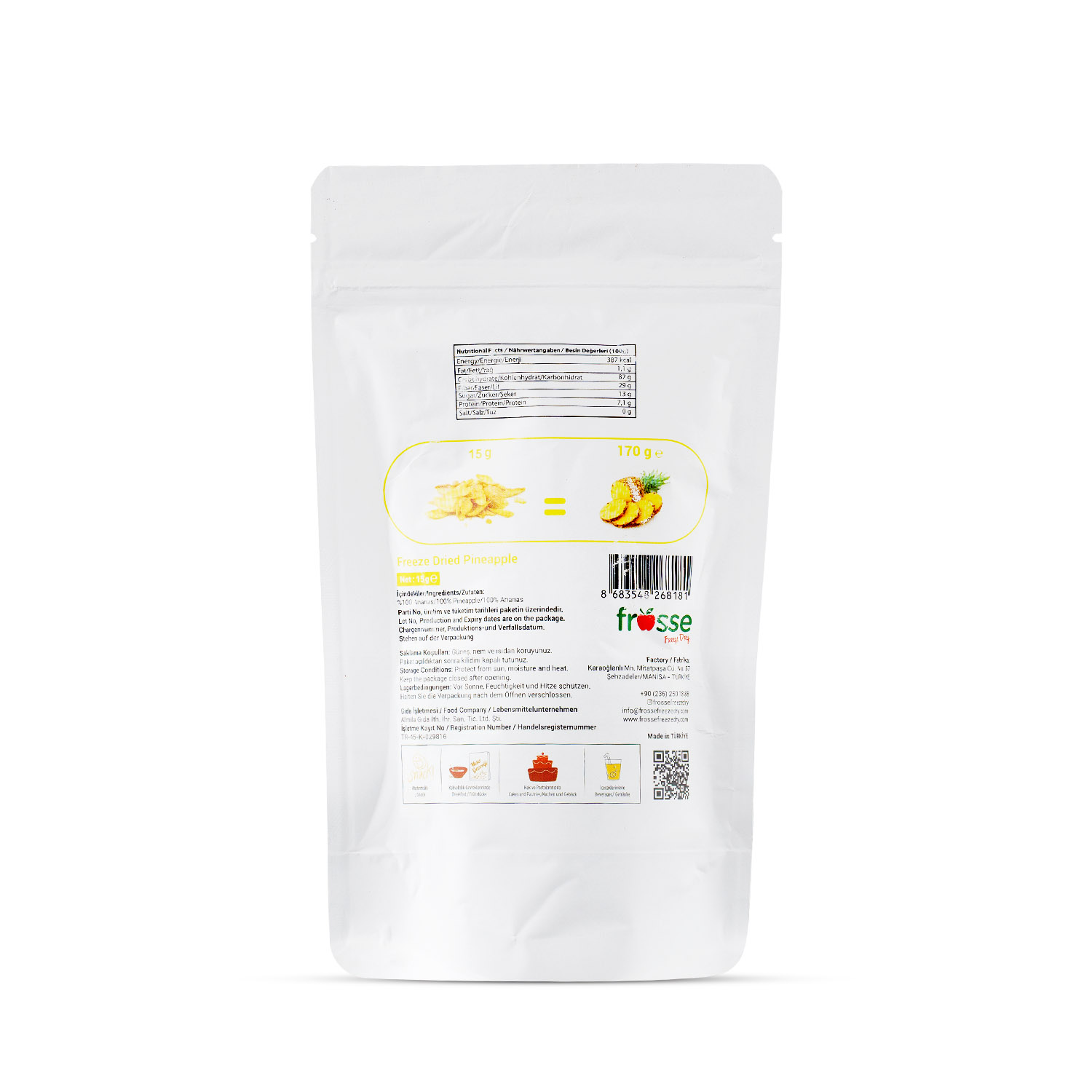 - Freezee Dried Teknolojisi: Ananaslar, vitamin ve mineral değerlerini kaybetmeden Freezee Dried teknolojisi ile kurutulmuştur.
